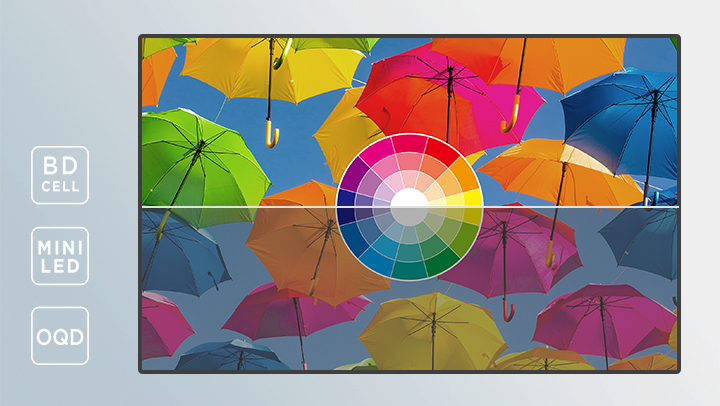 通过BD cell、Mini LED、OQD等技术,达到比肩OLED的超高对比度和色彩还原